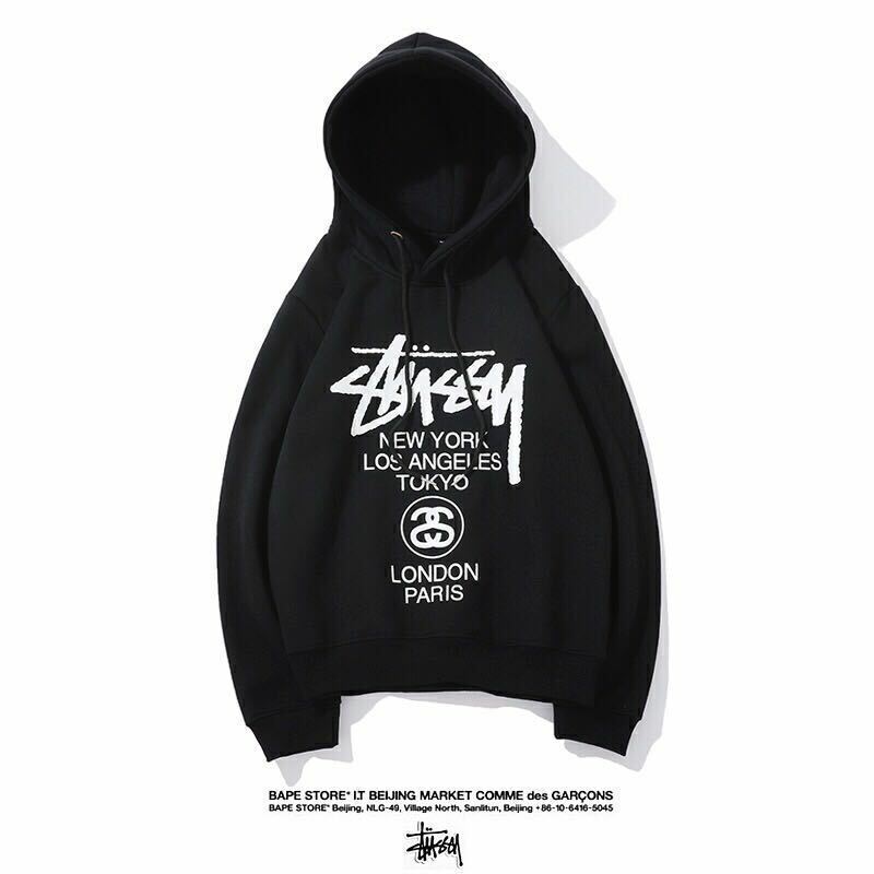 O moletom com capuz Stussy World Tour preto vem em uma cor toda preta. Nomes de cidades impressos em tela branca, que homenageiam os criadores de tendências na indústria da moda, aparecem na frente e nas costas.